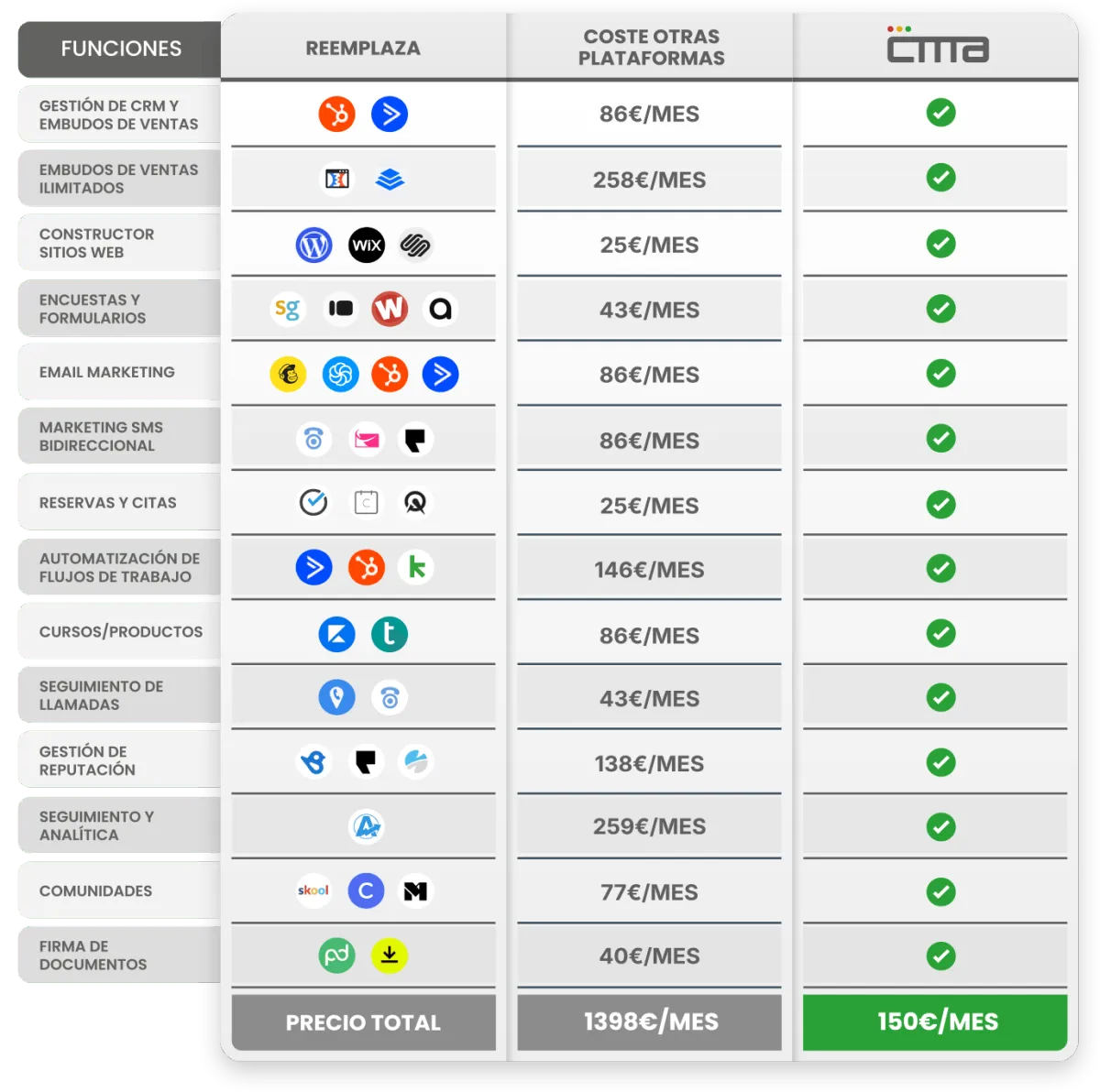 Con nuestra plataforma de marketing y ventas todo en uno, podrás mantener tus herramientas en un solo lugar (mientras ahorras tu dinero) y agilizar todo tu proceso de entrega para centrarte en mantener satisfechos a tus clientes.